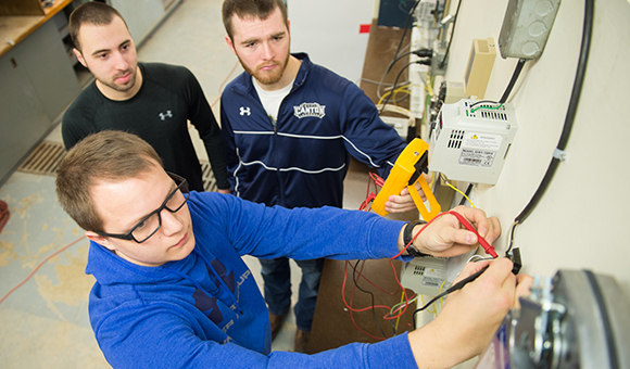 SUNY Canton Air Conditioning Engineering Technology students Zackary T. Flanagan, Brendan J. Jerkowski and Garrett J. Fields measure a feedback signal on a newly constructed training board for air handler devices located in the college’s Harry King Air Conditioning laboratory. The training board was assembled with components and measurement equipment purchased through an undergraduate program equipment grant from the American Society of Heating, Refrigeration, and Air-Conditioning Engineers (ASHRAE). Flanagan is an ASHRAE student member from Madrid, Jerkowski hails from Tillson and Fields is from Dexter.
