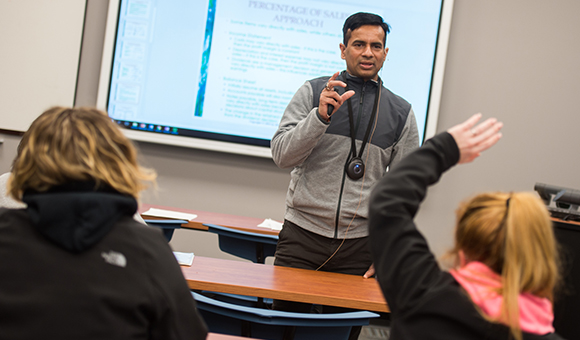 Pictured is SUNY Canton Associate Professor Umesh Kumar, who teaches Finance, presenting a Flex Class. Kumar is wearing a video camera tracking device and a headset microphone to record and broadcast his lecture as he is teaching it.