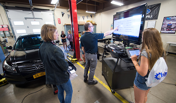 SUNY Canton Assistant Professor Brandon Baldwin showcases the technology in the Automotive Technology Lab.