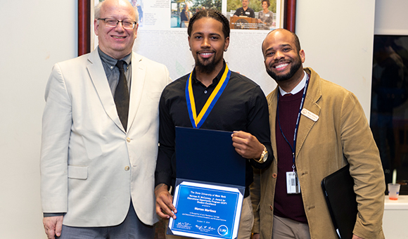 Marcos L. Martinez, a Practical Nursing major from the Bronx, received the 2019 Norman R. McConney Jr. Award, which is bestowed to recognize excellence in the SUNY Educational Opportunity Program (EOP). The award is named after one of the architects of the statewide program that provides financial assistance and support to those facing obstacles in achieving their educational and personal goals.