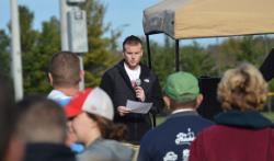 Left, Marcus Smith welcomes the 64 golfers! Right, Michael Bay presents members of the Renzi Brothers Team with their hole sponsor flag. Renzi Brothers from Watertown, NY has been the tournament’s corporate sponsor each year.